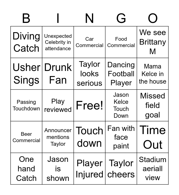 This bingo card has a free space and 26 words: Touch down, Taylor cheers, Taylor looks serious, Jason is shown, We see Brittany M, Diving Catch, Usher Sings, Unexpected Celebrity in attendance, Missed field goal, Fan with face paint, Dancing Football Player, Passing Touchdown, Time Out, One hand Catch, Play reviewed, Angry Coach, Food Commercial, Beer Commercial, Car Commercial, Stadium aeriall view, Mama Kelce in the house, Player Injured, Jason Kelce Touch Down, Announcer mentions Taylor, Drunk Fan and Travis K blows a kiss or makes heart.