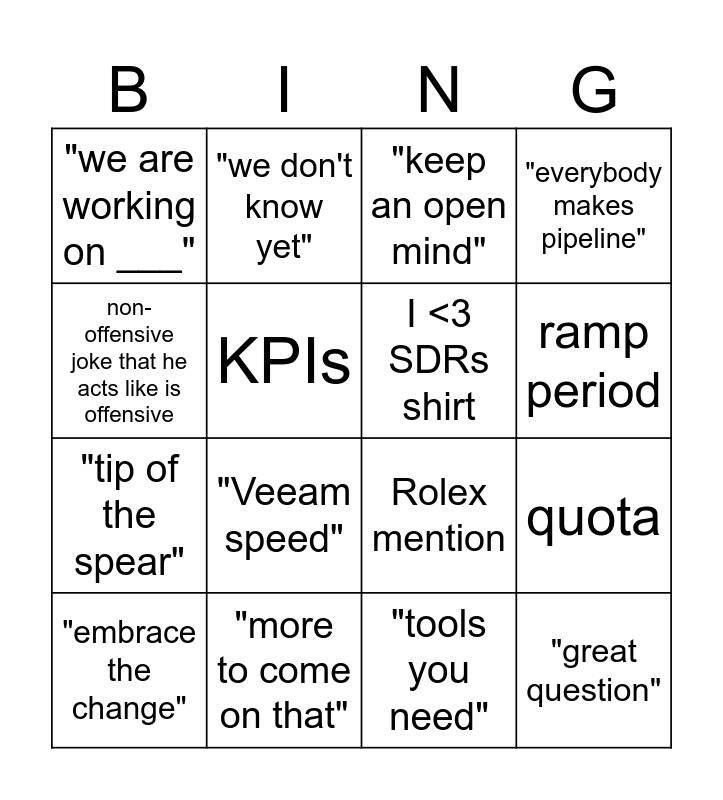 This bingo card has 17 words: "tools you need", "embrace the change", "keep an open mind", "we are working on ___", "Veeam speed", "everybody makes pipeline", quota, I <3 SDRs shirt, ramp period, KPIs, "more to come on that", Rolex mention, non-offensive joke that he acts like is offensive, "we don't know yet", "tip of the spear", travel anecdote and "great question".