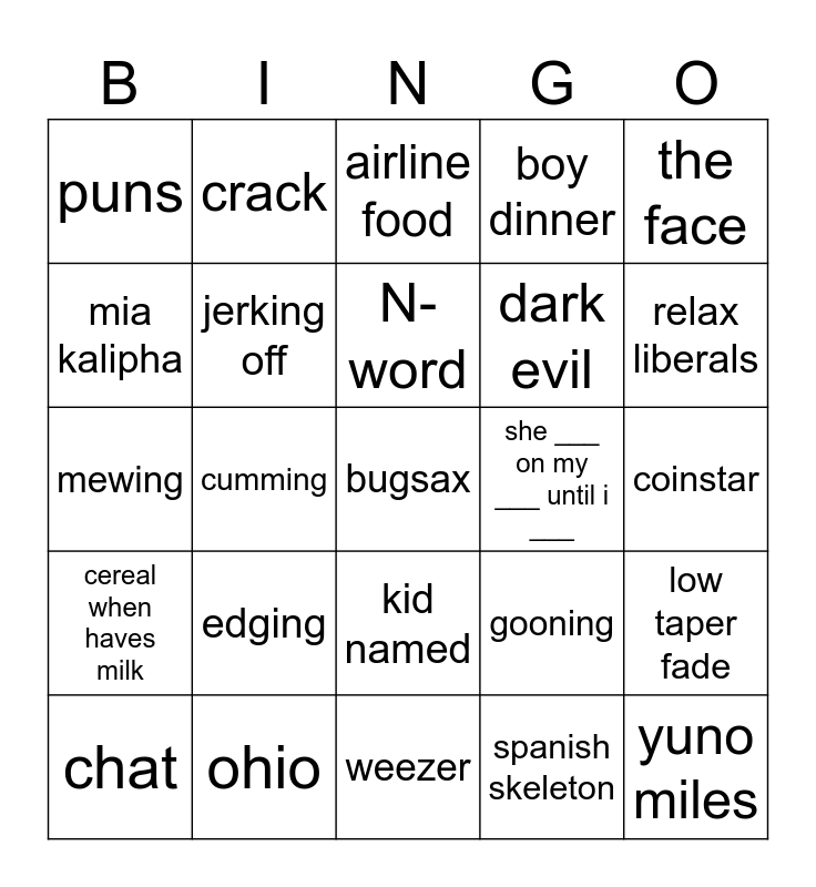 This bingo card has 25 words: edging, weezer, N-word, chat, the face, puns, mia kalipha, crack, she ___ on my ___ until i ___, kid named, dark evil, mewing, gooning, low taper fade, jerking off, yuno miles, coinstar, airline food, relax liberals, cumming, bugsax, ohio, cereal when haves milk, boy dinner and spanish skeleton.