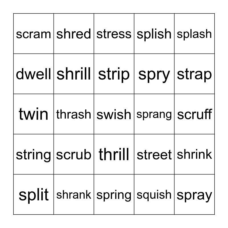 This bingo card has 25 words: scrub, spring, strip, split, splash, scram, dwell, shred, sprang, thrill, spry, twin, street, shrink, shrill, spray, scruff, stress, strap, thrash, swish, shrank, string, splish and squish.