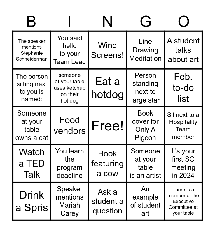 This bingo card has a free space and 24 words: You learn the program deadline, Speaker mentions Mariah Carey, Eat a hotdog, Drink a Spris, A student talks about art, The speaker mentions Stephanie Schneiderman, The person sitting next to you is named:, You said hello to your Team Lead, Book cover for Only A Pigeon, Book featuring a cow, Person standing next to large star, Someone at your table owns a cat, Someone at your table is an artist, It's your first SC meeting in 2024, someone at your table uses ketchup on their hot dog, An example of student art, Sit next to a Hospitality Team member, Wind Screens!, Feb. to-do list, Food vendors, There is a member of the Executive Committee at your table, Watch a TED Talk, Line Drawing Meditation and Ask a student a question.