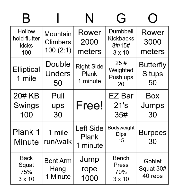 This bingo card has a free space and 24 words: 1 mile run/walk, Bent Arm Hang 1 Minute, Right Side Plank 1 minute, Back Squat 75% 3 x 10, Rower 3000 meters, Hollow hold flutter kicks 100, Elliptical 1 mile, Mountain Climbers 100 (2:1), EZ Bar 21's 35#, Left Side Plank 1 minute, 25 # Weighted Push ups 20, 20# KB Swings 100, Bodyweight Dips 15, Burpees 30, Double Unders 50, Bench Press 70% 3 x 10, Box Jumps 30, Rower 2000 meters, Butterfly Situps 50, Pull ups 30, Goblet Squat 30# 40 reps, Plank 1 Minute, Dumbbell Kickbacks 8#/15# 3 x 10 and Jump rope 1000.