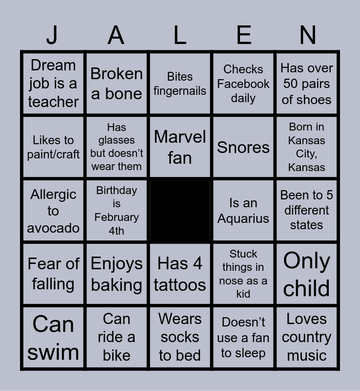 This bingo card has a free space and 24 words: Enjoys baking, Can ride a bike, Marvel fan, Can swim, Has over 50 pairs of shoes, Dream job is a teacher, Likes to paint/craft, Broken a bone, Is an Aquarius, Has 4 tattoos, Snores, Allergic to avocado, Stuck things in nose as a kid, Only child, Has glasses but doesn’t wear them, Doesn’t use a fan to sleep, Been to 5 different states, Bites fingernails, Born in Kansas City, Kansas, Birthday is February 4th, Loves country music, Fear of falling, Checks Facebook daily and Wears socks to bed.