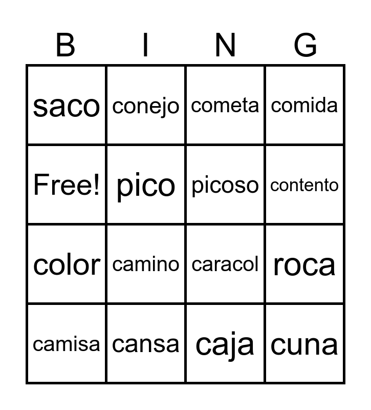 This bingo card has 16 words: cansa, roca, cometa, saco, color, conejo, caracol, caja, Free!, pico, camisa, comida, camino, contento, picoso and cuna.