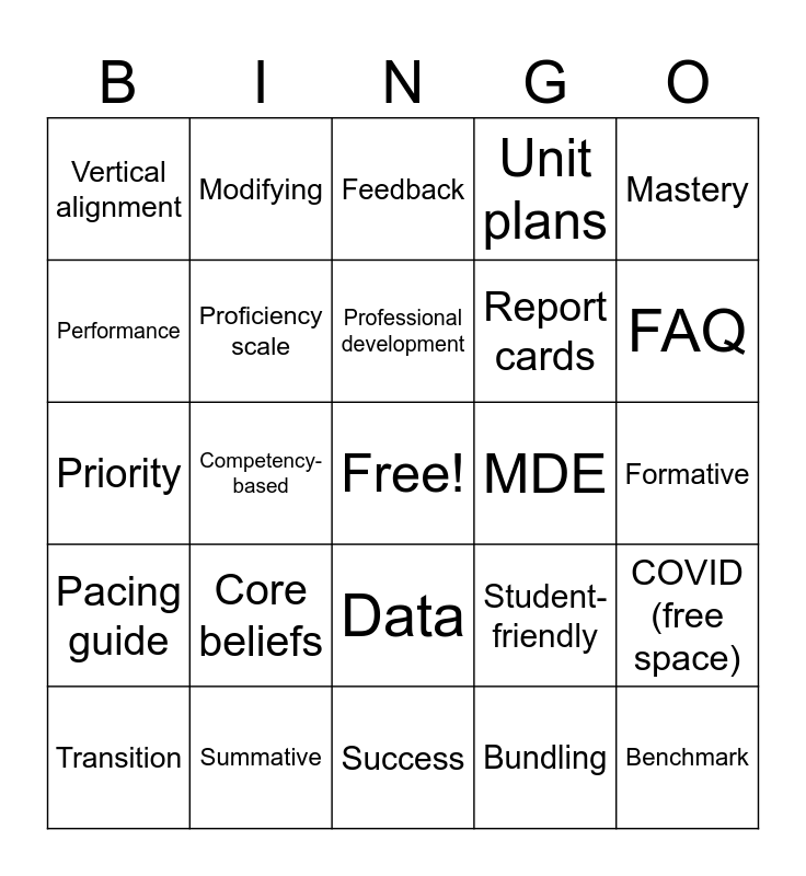 This bingo card has a free space and 32 words: Bundling, Marzano, Competency-based, Curriculum, Pacing guide, Proficiency scale, Mastery, COVID (free space), Modifying, Implementation, Professional development, Feedback, Parents, Evidence, MDE, Standards, Transition, Priority, Data, Core beliefs, Student-friendly, Learning targets, Formative, Summative, Benchmark, Unit plans, Report cards, Performance, Vertical alignment, Success, Letter grades and FAQ.