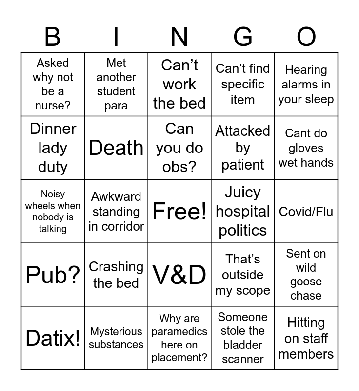 This bingo card has a free space and 24 words: Crashing the bed, Mysterious substances, Can you do obs?, Datix!, Hearing alarms in your sleep, Asked why not be a nurse?, Dinner lady duty, Met another student para, Juicy hospital politics, V&D, Attacked by patient, Noisy wheels when nobody is talking, That’s outside my scope, Sent on wild goose chase, Death, Someone stole the bladder scanner, Covid/Flu, Can’t work the bed, Cant do gloves wet hands, Awkward standing in corridor, Hitting on staff members, Pub?, Can’t find specific item and Why are paramedics here on placement?.