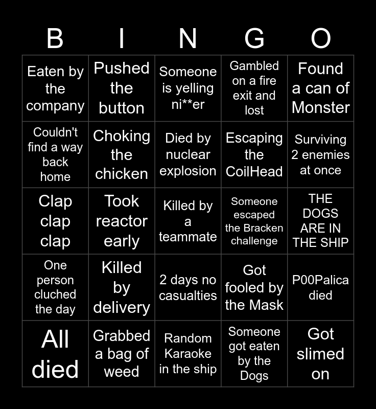 This bingo card has 76 words: Free!, Someone is AFK, Someone is yelling ni**er, Buns fell to her death, Someone stepped on a mine, Random Screaming, Ship left without someone, Got 0 value on gamba, Random loud singing, Killed by Bracken, Got slimed on, Saw Babaroga on wheels, Died by nuclear explosion, Couldn't find a way back home, Failed a jump, Took reactor early, Spamming the horn, Killed by a teammate, Found a mechanical keyboard, Found a can of Monster, Komrade dance, Clap clap clap, Choking the chicken, Pushed the button, Gambled on a fire exit and lost, Gambling to meet the quota, Saw Yippie, Greed leads to death, Didn't meet the quota, Killed something with a shotgun, Killed a teammate with a shotgun, Little girl is following you, THE BEES ARE IN THE SHIP, Got fooled by the Mask, Surviving 2 enemies at once, Escaping the CoilHead, Monsters right on the main entrance, Useless purchase, THE DOGS ARE IN THE SHIP, Someone got eaten by the Dogs, Random pornstar level moaning, Lightning struck someone, Escaped the Backrooms, Died in the Backrooms, Someone watching yt, All survived, All died, Eaten by the company, You survived 3 days, You survived 2 days, 1 day of no casualties, 2 days no casualties, Going to an eclipsed moon, Dying on an eclipsed moon, Everyone is dancing, Restarting the game, Put the mask on, Someone is twerking, Jack in the box goes ham, Going to a foggy moon, Killed by delivery, Thumper thumped someone, The little girl types creepy messages, Library type map, Someone pretending to be the mask, Killed by Bracken, Someone escaped the Bracken challenge, Disconnected randomly, Tryteg died, Hrca died, P00Palica died, One person cluched the day, Grabbed a bag of weed, Gambling even tho we don't need to, Random Karaoke in the ship and Mask got into the ship.