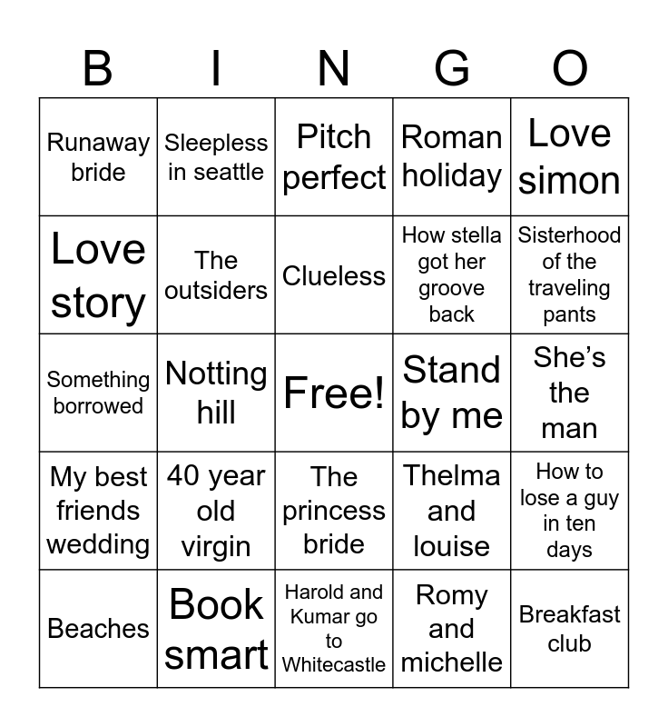 This bingo card has a free space and 63 words: 10 things I hate about you, She’s all that, Never been kissed, How to lose a guy in ten days, Pride and prejudice, You’ve got mail, Sleepless in seattle, When harry met sally, Clueless, Ever after, The princess bride, 13 going on 30, She’s the man, Love simon, Say anything, Love story, Notting hill, Runaway bride, My big fat Greek wedding, How stella got her groove back, 40 year old virgin, My best friends wedding, Roman holiday, Bridget Jones diary, While you were sleeping, To all the boys I loved before, Sixteen candles, Pretty in pink, Pretty woman, 27 dresses, The proposal, Must love dogs, Under the Tuscan Sun, Crazy stupid love, Sisterhood of the traveling pants, Beaches, Now and then, Romy and michelle, Bridesmaids, The outsiders, Something borrowed, Stand by me, The heathers, Girls trip, Breakfast club, Book smart, Perks of being a wallflower, Thelma and louise, Divine Secrets of the Ya Ya Sisterhood, The Goonies, Dumb and dumber, Harold and Kumar go to Whitecastle, Superbad, Bridewars, A league of their own, Pitch perfect, The sweetest thing, Practical magic, Mean girls, John tucker must die, Steel magnolias, Center stage and Mama mia.