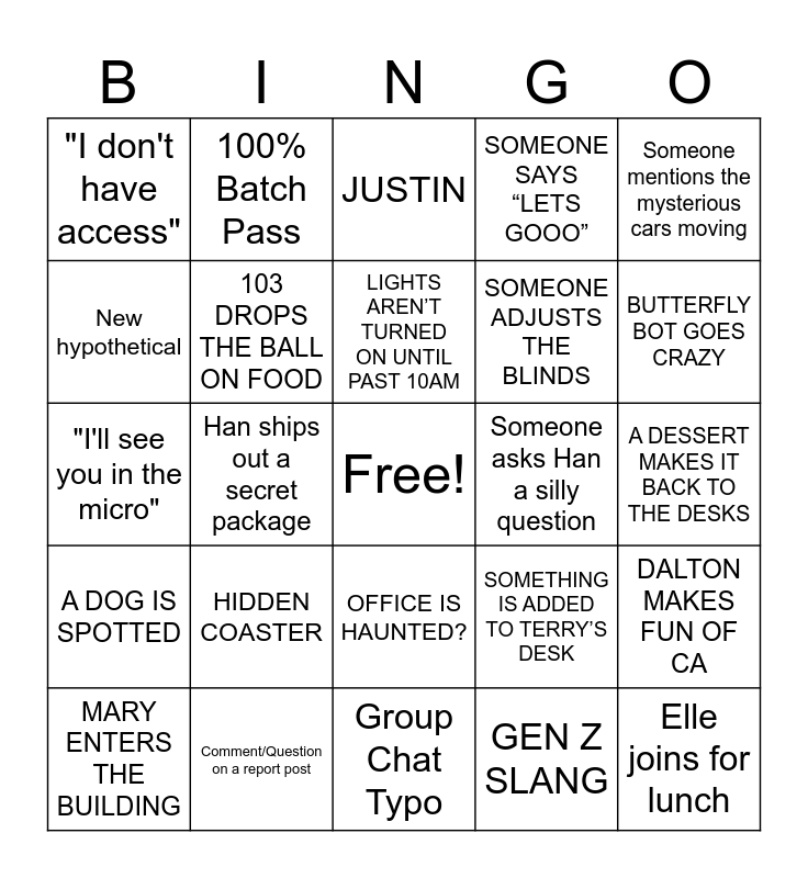 This bingo card has a free space and 24 words: HIDDEN COASTER, Comment/Question on a report post, LIGHTS AREN’T TURNED ON UNTIL PAST 10AM, MARY ENTERS THE BUILDING, Someone mentions the mysterious cars moving, "I don't have access", New hypothetical, 100% Batch Pass, Someone asks Han a silly question, OFFICE IS HAUNTED?, SOMEONE ADJUSTS THE BLINDS, "I'll see you in the micro", SOMETHING IS ADDED TO TERRY’S DESK, DALTON MAKES FUN OF CA, 103 DROPS THE BALL ON FOOD, GEN Z SLANG, A DESSERT MAKES IT BACK TO THE DESKS, JUSTIN, BUTTERFLY BOT GOES CRAZY, Han ships out a secret package, Elle joins for lunch, A DOG IS SPOTTED, SOMEONE SAYS “LETS GOOO” and Group Chat Typo.