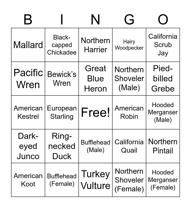 This bingo card has a free space and 40 words: Acorn Woodpecker, American Kestrel, Bald Eagle, Bewick’s Wren, Bufflehead (Female), Bufflehead (Male), Great Blue Heron, Cackling Goose, California Scrub Jay, Dark-eyed Junco, European Starling, Hairy Woodpecker, Hooded Merganser (Female), Hooded Merganser (Male), American Robin, Ring-necked Duck, Killdeer, Mallard, Northern Flicker, Northern Harrier, Northern Pintail, Northern Shoveler (Female), Northern Shoveler (Male), Pacific Wren, Red-breasted Sapsucker, Red-tailed Hawk, Red-winged Blackbird, Song Sparrow, Spotted Towhee, White-crowned Sparrow, Yellow-rumped Warbler (Audubon), American Koot, Canada Goose, California Quail, Pied-billed Grebe, Turkey Vulture, Black Phoebe, Steller's Jay, Black-capped Chickadee and Wood Duck.