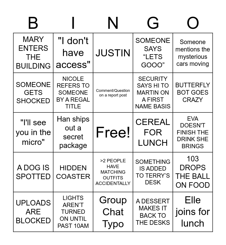 This bingo card has a free space and 24 words: HIDDEN COASTER, LIGHTS AREN’T TURNED ON UNTIL PAST 10AM, Comment/Question on a report post, UPLOADS ARE BLOCKED, Someone mentions the mysterious cars moving, MARY ENTERS THE BUILDING, SOMEONE GETS SHOCKED, "I don't have access", CEREAL FOR LUNCH, >2 PEOPLE HAVE MATCHING OUTFITS ACCIDENTALLY, SECURITY SAYS HI TO MARTIN ON A FIRST NAME BASIS, "I'll see you in the micro", SOMETHING IS ADDED TO TERRY’S DESK, 103 DROPS THE BALL ON FOOD, NICOLE REFERS TO SOMEONE BY A REGAL TITLE, A DESSERT MAKES IT BACK TO THE DESKS, EVA DOESN'T FINISH THE DRINK SHE BRINGS, JUSTIN, BUTTERFLY BOT GOES CRAZY, Han ships out a secret package, Elle joins for lunch, A DOG IS SPOTTED, SOMEONE SAYS “LETS GOOO” and Group Chat Typo.