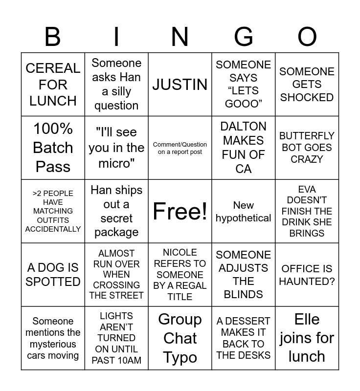 This bingo card has a free space and 24 words: ALMOST RUN OVER WHEN CROSSING THE STREET, LIGHTS AREN’T TURNED ON UNTIL PAST 10AM, Comment/Question on a report post, Someone mentions the mysterious cars moving, SOMEONE GETS SHOCKED, CEREAL FOR LUNCH, 100% Batch Pass, Someone asks Han a silly question, New hypothetical, NICOLE REFERS TO SOMEONE BY A REGAL TITLE, DALTON MAKES FUN OF CA, >2 PEOPLE HAVE MATCHING OUTFITS ACCIDENTALLY, SOMEONE ADJUSTS THE BLINDS, OFFICE IS HAUNTED?, "I'll see you in the micro", A DESSERT MAKES IT BACK TO THE DESKS, EVA DOESN'T FINISH THE DRINK SHE BRINGS, JUSTIN, BUTTERFLY BOT GOES CRAZY, Han ships out a secret package, Elle joins for lunch, A DOG IS SPOTTED, SOMEONE SAYS “LETS GOOO” and Group Chat Typo.