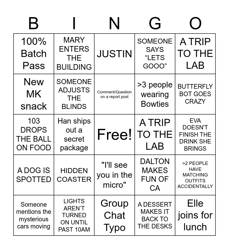 This bingo card has a free space and 24 words: HIDDEN COASTER, LIGHTS AREN’T TURNED ON UNTIL PAST 10AM, Comment/Question on a report post, Someone mentions the mysterious cars moving, A TRIP TO THE LAB, 100% Batch Pass, New MK snack, MARY ENTERS THE BUILDING, A TRIP TO THE LAB, "I'll see you in the micro", >3 people wearing Bowties, 103 DROPS THE BALL ON FOOD, DALTON MAKES FUN OF CA, >2 PEOPLE HAVE MATCHING OUTFITS ACCIDENTALLY, SOMEONE ADJUSTS THE BLINDS, A DESSERT MAKES IT BACK TO THE DESKS, EVA DOESN'T FINISH THE DRINK SHE BRINGS, JUSTIN, BUTTERFLY BOT GOES CRAZY, Han ships out a secret package, Elle joins for lunch, A DOG IS SPOTTED, SOMEONE SAYS “LETS GOOO” and Group Chat Typo.