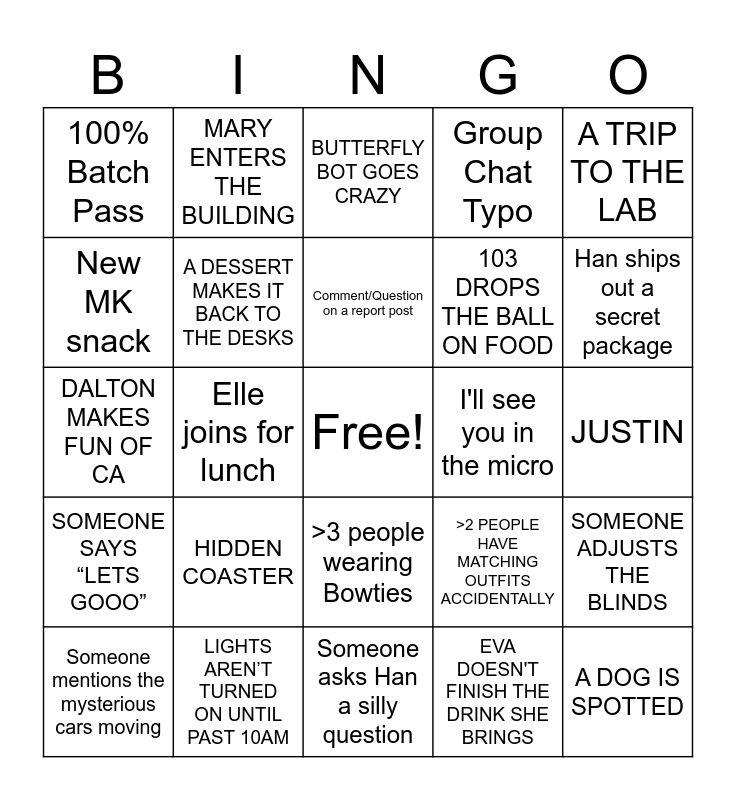 This bingo card has a free space and 24 words: HIDDEN COASTER, LIGHTS AREN’T TURNED ON UNTIL PAST 10AM, Comment/Question on a report post, Someone mentions the mysterious cars moving, A TRIP TO THE LAB, 100% Batch Pass, New MK snack, MARY ENTERS THE BUILDING, I'll see you in the micro, >3 people wearing Bowties, 103 DROPS THE BALL ON FOOD, DALTON MAKES FUN OF CA, >2 PEOPLE HAVE MATCHING OUTFITS ACCIDENTALLY, SOMEONE ADJUSTS THE BLINDS, A DESSERT MAKES IT BACK TO THE DESKS, EVA DOESN'T FINISH THE DRINK SHE BRINGS, JUSTIN, BUTTERFLY BOT GOES CRAZY, Han ships out a secret package, Elle joins for lunch, A DOG IS SPOTTED, SOMEONE SAYS “LETS GOOO”, Group Chat Typo and Someone asks Han a silly question.