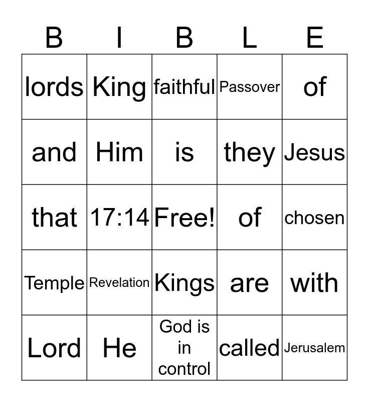 This bingo card has a free space and 24 words: Revelation, He, is, Lord, of, lords, and, King, of, Kings, they, that, are, with, Him, called, chosen, faithful, Jesus, 17:14, Jerusalem, Temple, Passover and God is in control.