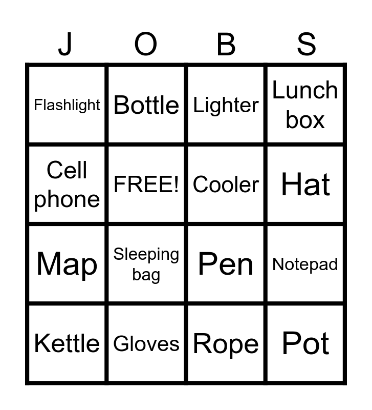 This bingo card has 24 words: Boots, Camera, Hat, Knife, Cell phone, Flashlight, FREE!, Bottle, Gloves, First-aid kit, Map, Pen, Backpack, Newspaper, Cooler, Tent, Rope, Lighter, Sleeping bag, Notepad, Kettle, Pot, Lunch box and Sneakers.