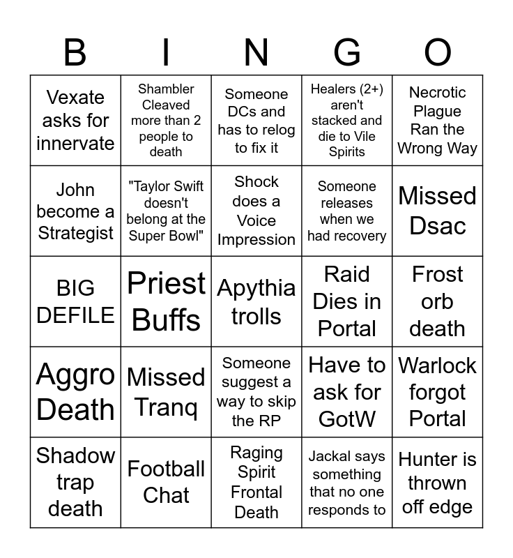 This bingo card has 25 words: Missed Tranq, Raging Spirit Frontal Death, Shock does a Voice Impression, Shadow trap death, Necrotic Plague Ran the Wrong Way, Vexate asks for innervate, John become a Strategist, Shambler Cleaved more than 2 people to death, Raid Dies in Portal, Someone suggest a way to skip the RP, Someone releases when we had recovery, BIG DEFILE, Have to ask for GotW, Warlock forgot Portal, "Taylor Swift doesn't belong at the Super Bowl", Hunter is thrown off edge, Frost orb death, Someone DCs and has to relog to fix it, Missed Dsac, Priest Buffs, Apythia trolls, Football Chat, Aggro Death, Healers (2+) aren't stacked and die to Vile Spirits and Jackal says something that no one responds to.