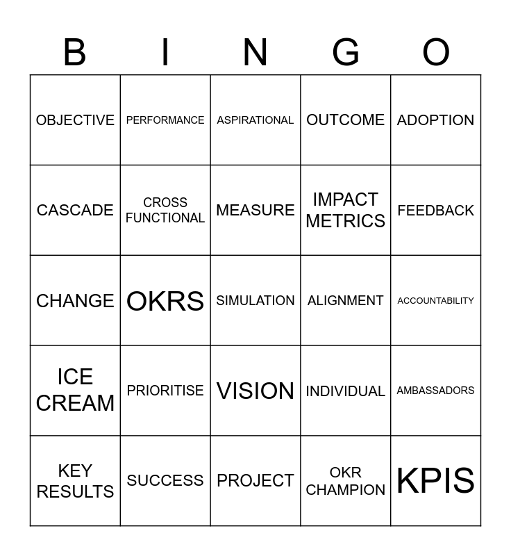This bingo card has a free space and 24 words: PRIORITISE, SUCCESS, MEASURE, KEY RESULTS, ADOPTION, OBJECTIVE, CASCADE, PERFORMANCE, ALIGNMENT, VISION, IMPACT METRICS, CHANGE, INDIVIDUAL, AMBASSADORS, CROSS FUNCTIONAL, OKR CHAMPION, ACCOUNTABILITY, ASPIRATIONAL, FEEDBACK, OKRS, KPIS, ICE CREAM, OUTCOME and PROJECT.