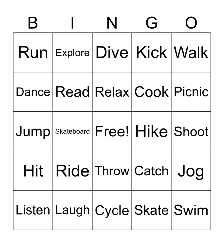 This bingo card has a free space and 27 words: Catch, Climb, Cook, Cycle, Dance, Dive, Explore, Hit, Hike, Jog, Jump, Kick, Listen, Laugh, Picnic, Play, Read, Relax, Ride, Run, Shoot, Skate, Skateboard, Swim, Throw, Walk and Watch.