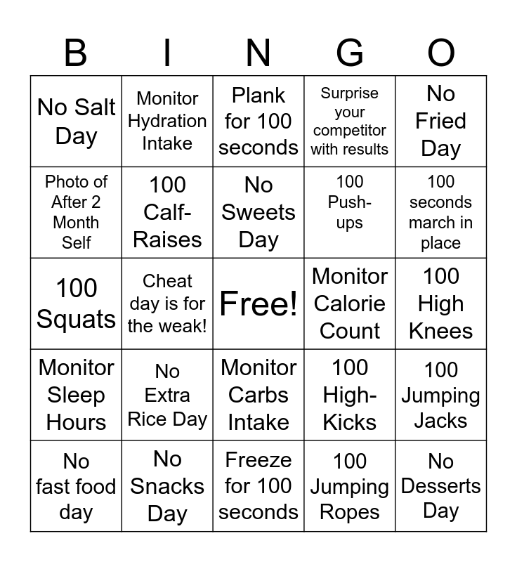 This bingo card has a free space and 24 words: No Extra Rice Day, No Snacks Day, No Sweets Day, No fast food day, No Fried Day, No Salt Day, Photo of After 2 Month Self, Monitor Hydration Intake, Monitor Calorie Count, Monitor Carbs Intake, 100 Push-ups, 100 Squats, 100 High-Kicks, 100 Jumping Jacks, 100 Calf-Raises, 100 Jumping Ropes, 100 High Knees, Plank for 100 seconds, 100 seconds march in place, Cheat day is for the weak!, No Desserts Day, Monitor Sleep Hours, Surprise your competitor with results and Freeze for 100 seconds.