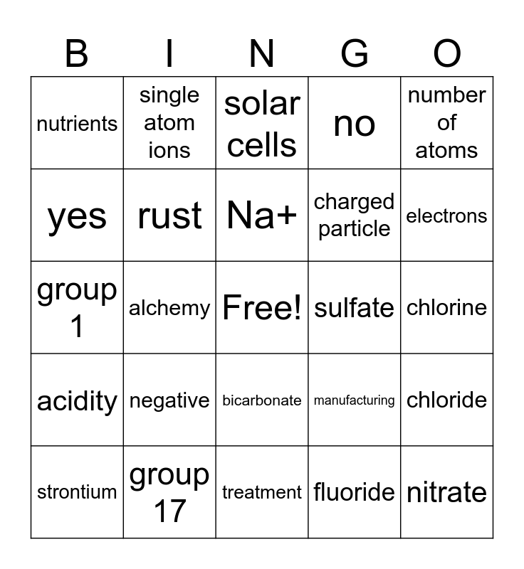 This bingo card has a free space and 31 words: treatment, data storage, alchemy, semiconductor, nutrients, solar cells, rust, manufacturing, sulfate, fluoride, chlorine, nitrate, polyatomic, one, electrons, covalent, chloride, negative, acidity, bicarbonate, number of atoms, ammonium, strontium, single atom ions, charged particle, yes, no, group 1, group 17, Na+ and OH-.