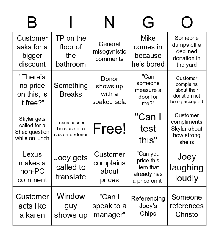 This bingo card has a free space and 24 words: Joey gets called to translate, Window guy shows up, Donor shows up with a soaked sofa, Customer acts like a karen, Someone dumps off a declined donation in the yard, Customer asks for a bigger discount, "There's no price on this, is it free?", TP on the floor of the bathroom, "Can I test this", Customer complains about prices, "Can someone measure a door for me?", Skylar gets called for a Shed question while on lunch, "Can you price this item that already has a price on it", Joey laughing loudly, Something Breaks, Referencing Joey's Chips, Customer compliments Skylar about how strong she is, General misogynistic comments, Customer complains about their donation not being accepted, Lexus cusses because of a customer/donor, Someone references Christo, Lexus makes a non-PC comment, Mike comes in because he's bored and "Can I speak to a manager".