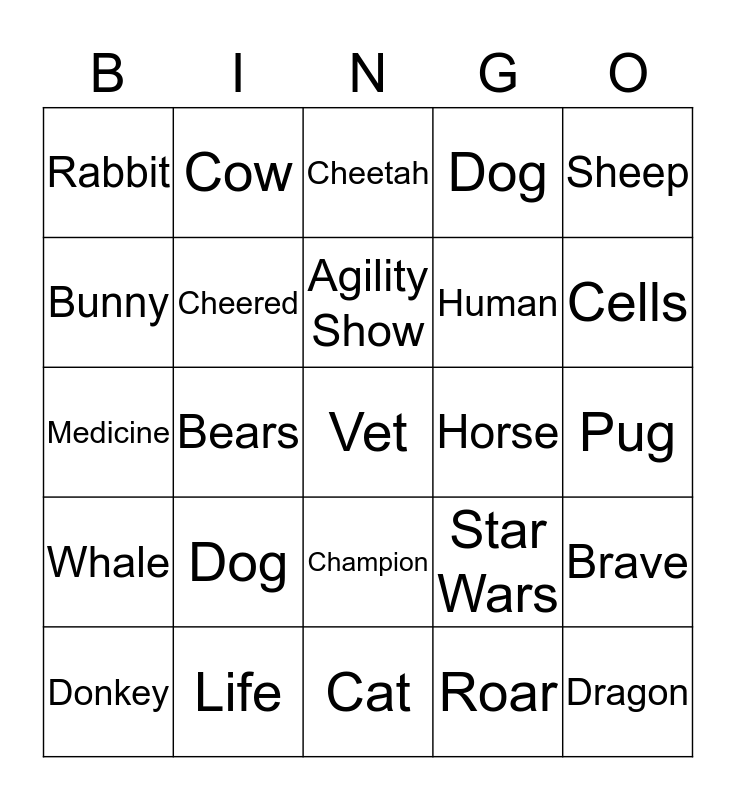 This bingo card has 25 words: Dog, Cat, Agility Show, Donkey, Sheep, Rabbit, Bunny, Cow, Horse, Champion, Human, Medicine, Star Wars, Brave, Cheered, Dragon, Pug, Cheetah, Cells, Bears, Vet, Life, Whale, Dog and Roar.