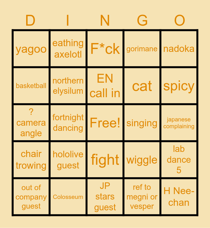 This bingo card has a free space and 25 words: hololive guest, JP stars guest, EN call in, out of company guest, nadoka, yagoo, basketball, eathing axelotl, singing, fight, cat, ? camera angle, wiggle, lab dance 5, northern elysilum, Gladiator assasin hitman, japanese complaining, F*ck, spicy, fortnight dancing, H Nee-chan, Colosseum, chair trowing, gorimane and ref to megni or vesper.