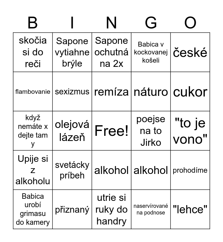 This bingo card has a free space and 27 words: alkohol, české, náturo, utrie si ruky do handry, flambovanie, Sapone ochutná na 2x, Sapone vytiahne brýle, Upije si z alkoholu, poejse na to Jirko, prohodíme, když nemáte x dejte tam y, Babica v kockovanej košeli, Babica urobí grimasu do kamery, přiznaný, cukor, ozdoba zo zeleniny, sexizmus, remíza, svetácky príbeh, skočia si do reči, "to je vono", naservírované na podnose, olejová lázeň, "lehce", alkohol, české and utrie si ruky do handry.