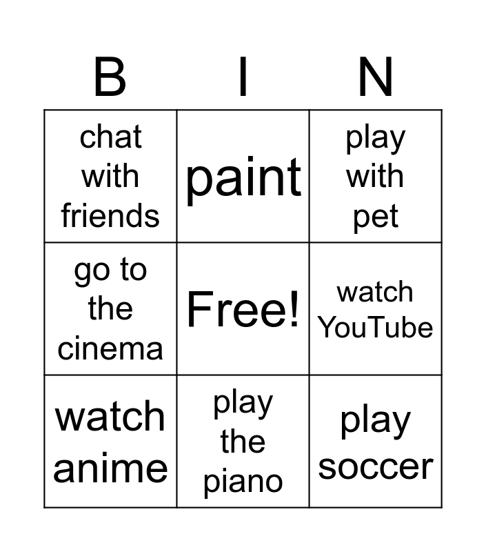 This bingo card has a free space and 21 words: do makeup, dance, paint, take photos, read comics, watch anime, chat with friends, play with pet, skate, play the piano, paint nails, go to the cinema, go shopping, study, watch YouTube, watch Reels, watch tv, play video games, play soccer, watch tiktok and listen to music.