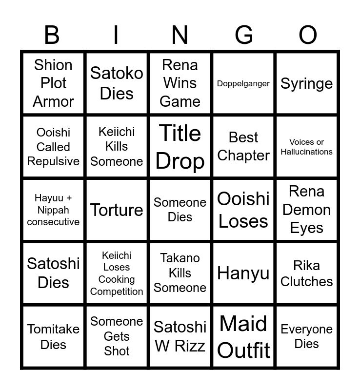 This bingo card has a free space and 24 words: Tomitake Dies, Keiichi Loses Cooking Competition, Title Drop, Maid Outfit, Syringe, Shion Plot Armor, Satoko Dies, Rena Wins Game, Ooishi Loses, Rena Demon Eyes, Hayuu + Nippah consecutive, Keiichi Kills Someone, Hanyu, Rika Clutches, Ooishi Called Repulsive, Someone Gets Shot, Satoshi W Rizz, Doppelganger, Voices or Hallucinations, Satoshi Dies, Torture, Takano Kills Someone, Best Chapter and Everyone Dies.