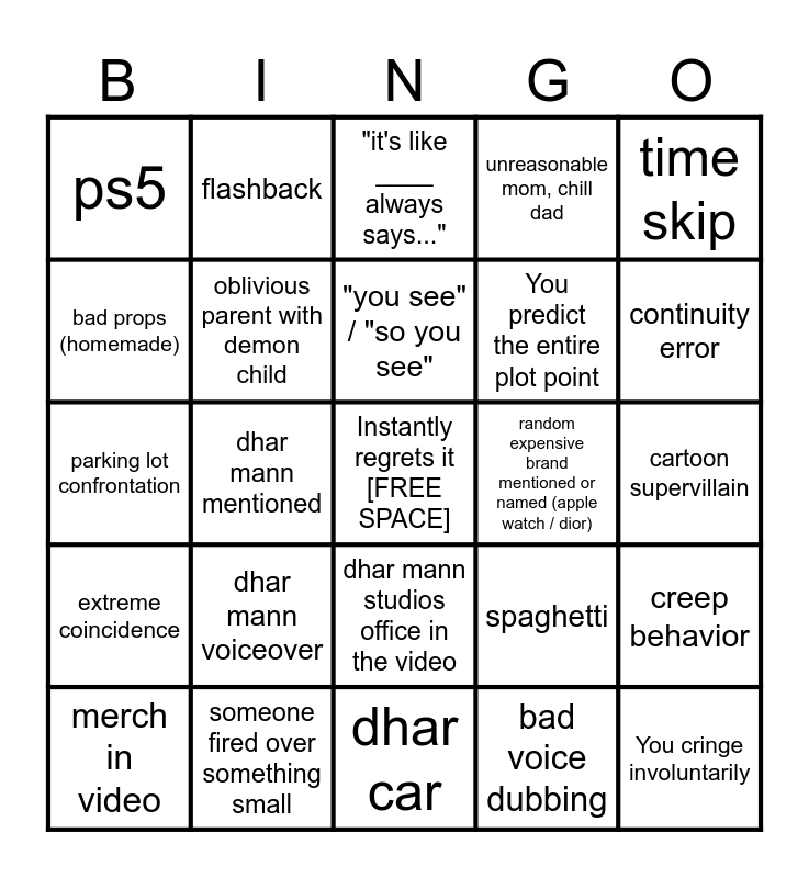 This bingo card has a free space and 25 words: dhar mann voiceover, dhar car, "you see" / "so you see", merch in video, time skip, ps5, bad props (homemade), flashback, random expensive brand mentioned or named (apple watch / dior), dhar mann studios office in the video, You predict the entire plot point, parking lot confrontation, spaghetti, creep behavior, oblivious parent with demon child, kids with ipad, cartoon supervillain, "it's like ____ always says...", continuity error, dhar mann mentioned, You cringe involuntarily, someone fired over something small, extreme coincidence, unreasonable mom, chill dad and bad voice dubbing.