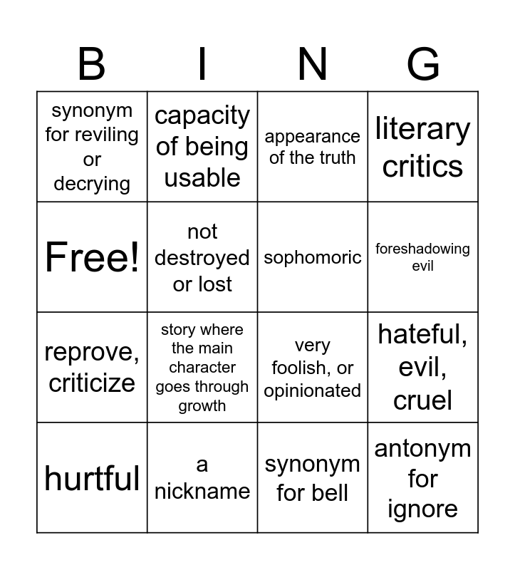 This bingo card has 16 words: a nickname, hateful, evil, cruel, appearance of the truth, synonym for reviling or decrying, reprove, criticize, capacity of being usable, very foolish, or opinionated, synonym for bell, Free!, not destroyed or lost, hurtful, literary critics, story where the main character goes through growth, foreshadowing evil, sophomoric and antonym for ignore.