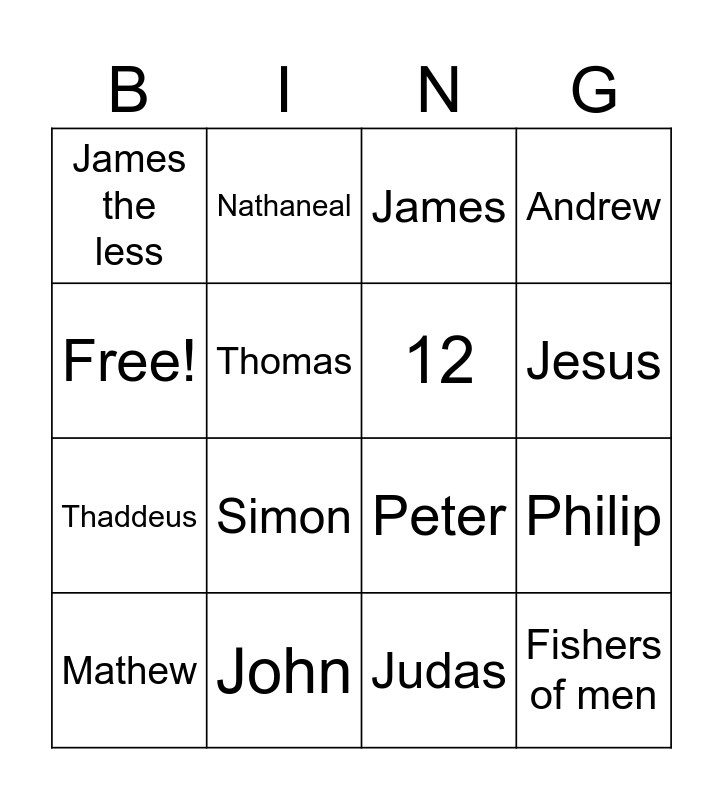 This bingo card has 16 words: John, Philip, James, James the less, Thaddeus, Nathaneal, Peter, Judas, Free!, Thomas, Mathew, Andrew, Simon, Jesus, 12 and Fishers of men.