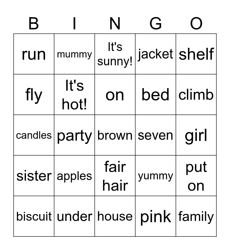 This bingo card has 128 words: Free!, mummy, daddy, grandma, grandpa, brother, sister, children, family, friend, colour, blue, green, red, white, yellow, house, tree house, chair, table, radio, bed, garden, bedroom, kitchen, black, brown, living room, bathroom, bath, candles, party, happy, sad, one, two, three, four, five, six, seven, eight, nine, ten, burgers chips, sandwiches, bananas, apples, chocolate, yummy, cake, biscuit, ice cream, pizza, chocolate cake, orange juice, milk, animal, fish, frog, bird, chimp, horse, swim, sing, run, jump, dance, climb, fly, boy, girl, clown, circus, magician, swing, funny, toy, toy soldier, ballerina, pink, shelf, teddy bear, toy box, on, in, under, dark hair, eyes, ears, mouth, nose, fair hair, puppet, jack-in-the-box, big, small, It's sunny!, It's hot!, It's raining!, jacket, coat, shorts, take off, put on, It's windy!, It's cold!, island, socks, shoes, jeans, T-shirt, skirt, flowers, music, summer, winter, autumn, spring, hat, eat, drink, turn around, touch the ground, climb the stairs, say your prayers, turn off the lights and say goodnight.