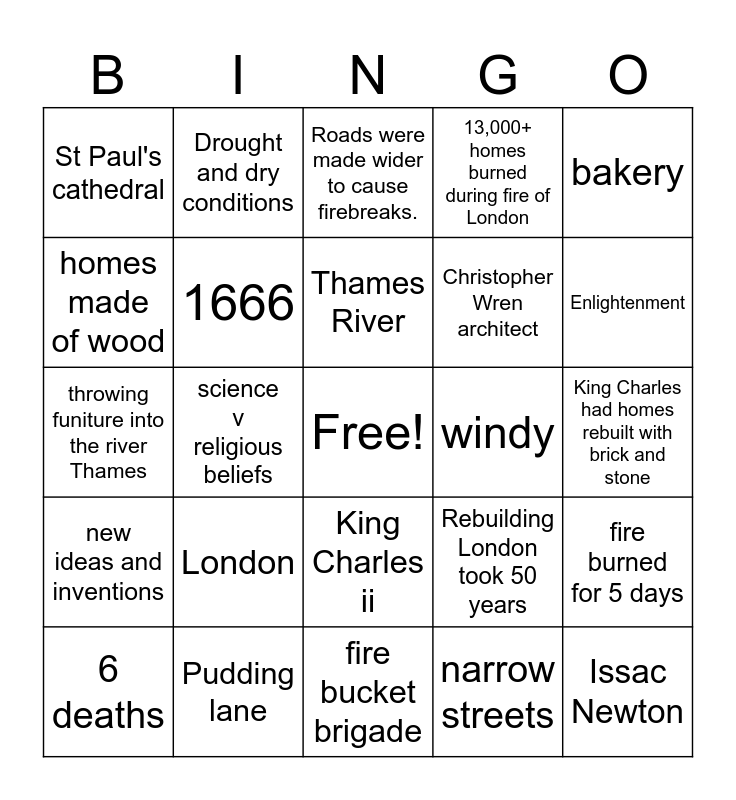 This bingo card has a free space and 24 words: London, Pudding lane, Thames River, 6 deaths, bakery, St Paul's cathedral, homes made of wood, Drought and dry conditions, windy, King Charles ii, Christopher Wren architect, throwing funiture into the river Thames, Rebuilding London took 50 years, fire burned for 5 days, 1666, narrow streets, King Charles had homes rebuilt with brick and stone, Roads were made wider to cause firebreaks., Enlightenment, science v religious beliefs, Issac Newton, new ideas and inventions, 13,000+ homes burned during fire of London and fire bucket brigade.