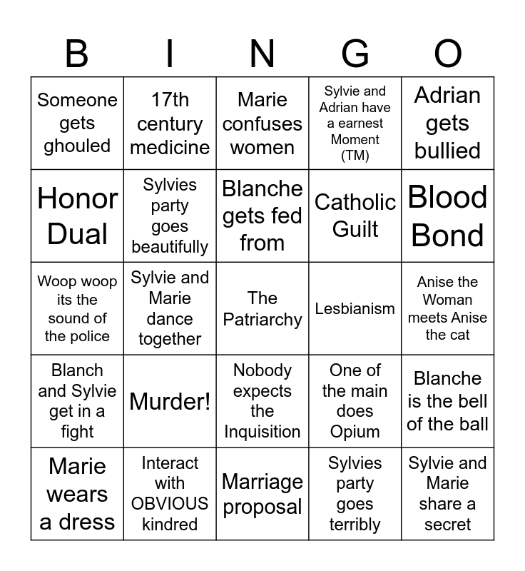 This bingo card has a free space and 24 words: Murder!, Interact with OBVIOUS kindred, Blanche gets fed from, Marie wears a dress, Adrian gets bullied, Someone gets ghouled, Honor Dual, 17th century medicine, Lesbianism, Nobody expects the Inquisition, Catholic Guilt, Woop woop its the sound of the police, One of the main does Opium, Blanche is the bell of the ball, Sylvies party goes beautifully, Sylvies party goes terribly, Anise the Woman meets Anise the cat, Marie confuses women, Blood Bond, Sylvie and Marie dance together, Sylvie and Marie share a secret, Blanch and Sylvie get in a fight, Sylvie and Adrian have a earnest Moment (TM) and Marriage proposal.