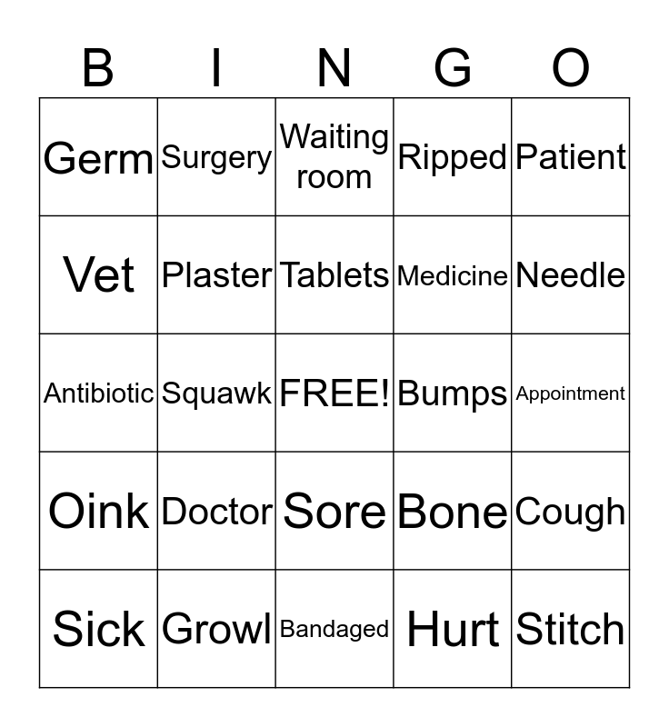 This bingo card has a free space and 25 words: Doctor, Bandaged, Tablets, Sick, Patient, Germ, Vet, Surgery, Bumps, Sore, Medicine, Antibiotic, Bone, Cough, Plaster, Nurse, Appointment, Waiting room, Needle, Squawk, Stitch, Growl, Oink, Ripped and Hurt.