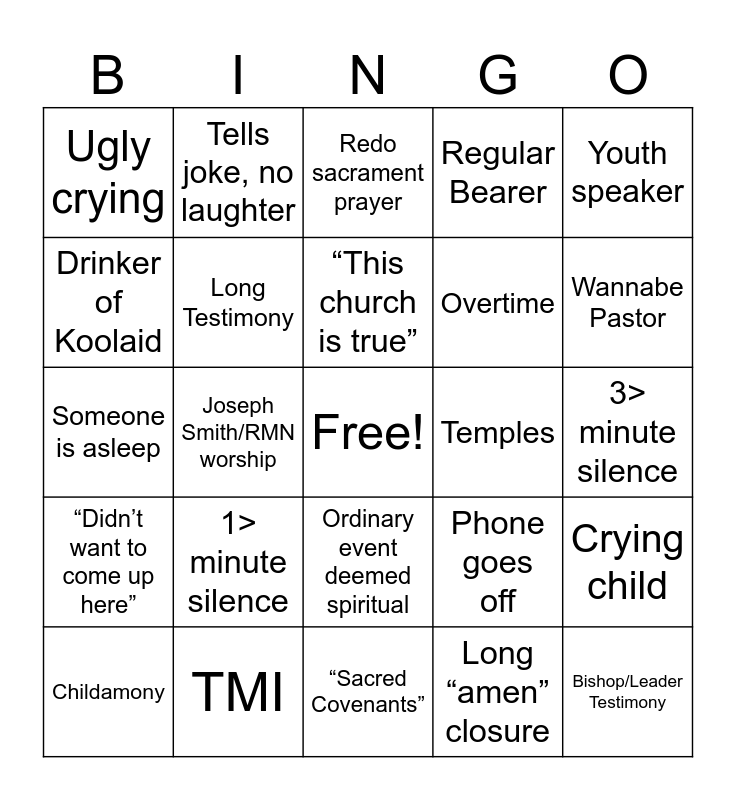 This bingo card has a free space and 29 words: Childamony, “Anti-Mormon”, Joseph Smith/RMN worship, “Last days”, Ugly crying, Redo sacrament prayer, Long Testimony, 1> minute silence, Temples, TMI, 3> minute silence, Bishop/Leader Testimony, “Sacred Covenants”, Long “amen” closure, Wannabe Pastor, Short & Sweet, Ordinary event deemed spiritual, “Didn’t want to come up here”, Youth speaker, Someone is asleep, Phone goes off, Letter from ___, Overtime, Drinker of Koolaid, Regular Bearer, Tells joke, no laughter, Crying child, “This church is true” and Annoying voice inflection.