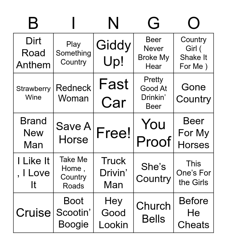 This bingo card has a free space and 62 words: Don’t Rock The Jukebox, Boot Scootin’ Boogie, Cowboy Casanova, I Like It , I Love It, How Do You Like Me Now?!, She Thinks My Tractor's Sexy, Redneck Woman, Redneck Yacht Club, Pretty Good At Drinkin’ Beer, Something lIke That, Beer Never Broke My Hear, Chattahoochee, Strawberry Wine, My Wish, Drunk ( And I Don't Wanna Go Home ), Dirt Road Anthem, Before He Cheats, Country Girl ( Shake It For Me ), Tennessee Whiskey, Fast Car, You Proof, Giddy Up!, Cruise, Church Bells, Gunpowder & Lead, God’s Country, It’s A Great Day To Be Alive, Tequila Makes Her Clothes Fall Off, This One’s For the Girls, Play it Again, I'm A Survivor, What Ifs, Red Solo Cup, Should’ve Been a CowBoy, Beer For My Horses, Play Something Country, It’s A Little Too Late, Knee Deep, Save A Horse, Watermelon Crawl, Brand New Man, Chicken Fried, Take Me Home , Country Roads, Third Rock From The Sun, Gone Country, She’s Country, When The Sun Goes Down, Ring Of Fire, I Walk The Line, Foggy Mountain Breakdown, Truck Drivin’ Man, Hey Good Lookin, Tulsa Time, The Devil Went Down To Georgia, Louisiana Woman , Mississippi Man, T-r-o-u-b-l-e, Down On The Farm, Some Beach, Summertime, Somethin Bad, Folsom Prison Blues and Friends In Low Places.