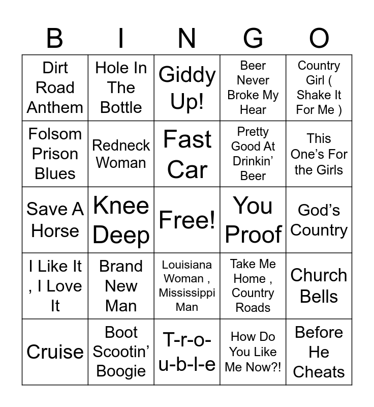 This bingo card has a free space and 58 words: Don’t Rock The Jukebox, Boot Scootin’ Boogie, Cowboy Casanova, I Like It , I Love It, How Do You Like Me Now?!, She Thinks My Tractor's Sexy, Redneck Woman, Redneck Yacht Club, Pretty Good At Drinkin’ Beer, Something lIke That, Beer Never Broke My Hear, Chattahoochee, Strawberry Wine, My Wish, Drunk ( And I Don't Wanna Go Home ), Dirt Road Anthem, Before He Cheats, Country Girl ( Shake It For Me ), Tennessee Whiskey, Fast Car, You Proof, Giddy Up!, Cruise, Church Bells, Gunpowder & Lead, God’s Country, It’s A Great Day To Be Alive, Tequila Makes Her Clothes Fall Off, This One’s For the Girls, Play it Again, I'm A Survivor, What Ifs, Red Solo Cup, Should’ve Been a CowBoy, Beer For My Horses, Play Something Country, It’s A Little Too Late, Knee Deep, Save A Horse, Watermelon Crawl, Brand New Man, Chicken Fried, Take Me Home , Country Roads, Third Rock From The Sun, Gone Country, She’s Country, The Devil Went Down To Georgia, Louisiana Woman , Mississippi Man, T-r-o-u-b-l-e, Down On The Farm, Some Beach, Summertime, Somethin Bad, Stuck Like Glue, Hole In The Bottle, Heads Carolina , Tails California, Folsom Prison Blues and Friends In Low Places.