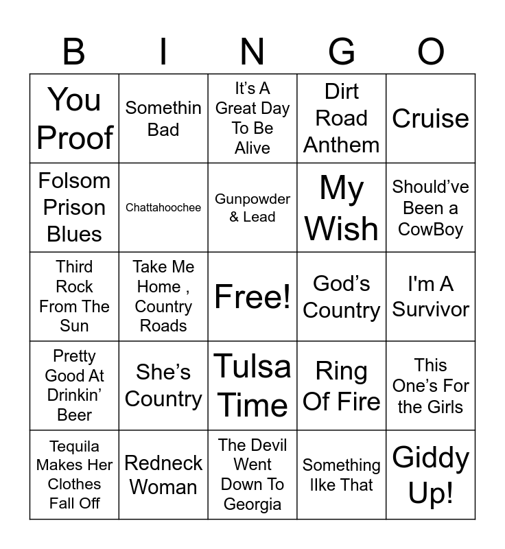 This bingo card has a free space and 58 words: She Thinks My Tractor's Sexy, Redneck Woman, Redneck Yacht Club, Pretty Good At Drinkin’ Beer, Something lIke That, Beer Never Broke My Hear, Chattahoochee, Strawberry Wine, My Wish, Drunk ( And I Don't Wanna Go Home ), Dirt Road Anthem, Before He Cheats, Country Girl ( Shake It For Me ), Tennessee Whiskey, Fast Car, You Proof, Giddy Up!, Cruise, Church Bells, Gunpowder & Lead, God’s Country, It’s A Great Day To Be Alive, Tequila Makes Her Clothes Fall Off, This One’s For the Girls, Play it Again, I'm A Survivor, What Ifs, Red Solo Cup, Should’ve Been a CowBoy, Beer For My Horses, Play Something Country, It’s A Little Too Late, Knee Deep, Save A Horse, Watermelon Crawl, Brand New Man, Chicken Fried, Take Me Home , Country Roads, Third Rock From The Sun, Gone Country, She’s Country, When The Sun Goes Down, Ring Of Fire, I Walk The Line, Foggy Mountain Breakdown, Truck Drivin’ Man, Hey Good Lookin, Tulsa Time, The Devil Went Down To Georgia, Louisiana Woman , Mississippi Man, T-r-o-u-b-l-e, Down On The Farm, Some Beach, Summertime, Somethin Bad, Stuck Like Glue, Folsom Prison Blues and Friends In Low Places.