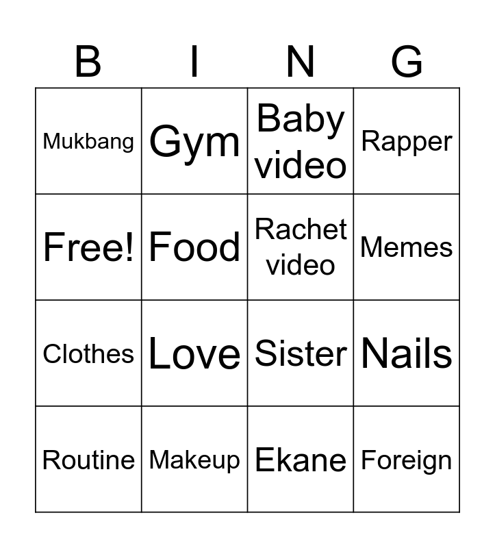 This bingo card has 16 words: Makeup, Nails, Baby video, Mukbang, Clothes, Gym, Sister, Ekane, Free!, Food, Routine, Rapper, Love, Memes, Rachet video and Foreign.