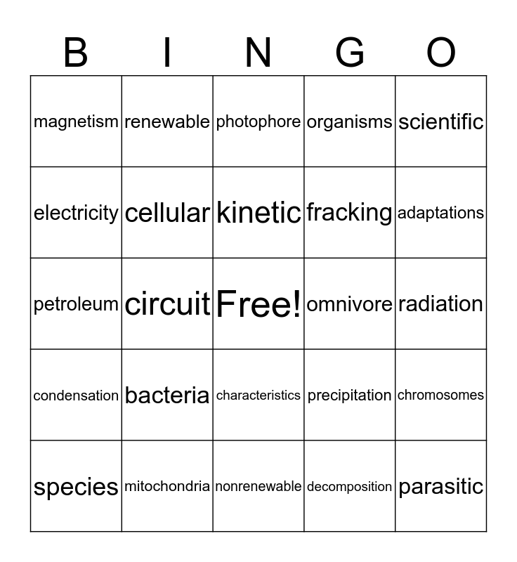 This bingo card has a free space and 36 words: photosynthesis, symbiosis, zooplankton, cellular, precipitation, condensation, kinetic, potential, scientific, gravity, circuit, organisms, herbivore, omnivore, adaptations, magnetism, weathering, bacteria, parasitic, photophore, radiation, chromosomes, mitochondria, species, nonrenewable, renewable, petroleum, disintegration, fracking, electricity, regional, carnivore, decomposition, characteristics, evaporation and evolution.