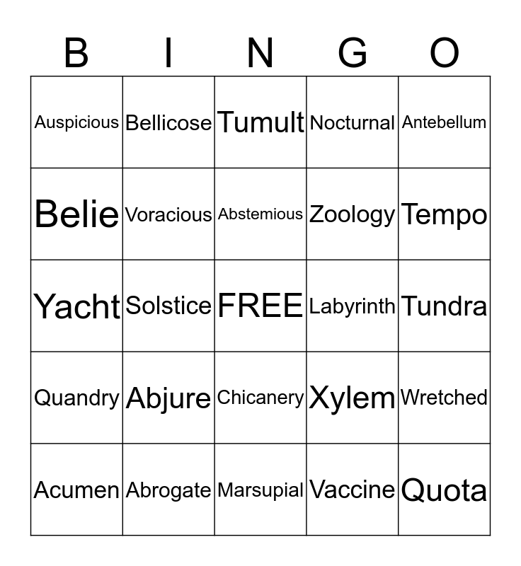 This bingo card has a free space and 24 words: Abjure, Abrogate, Abstemious, Acumen, Antebellum, Auspicious, Belie, Bellicose, Labyrinth, Chicanery, Zoology, Yacht, Xylem, Wretched, Voracious, Vaccine, Tundra, Tumult, Tempo, Solstice, Quota, Quandry, Nocturnal and Marsupial.