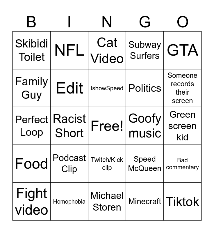 This bingo card has a free space and 24 words: Podcast Clip, Homophobia, IshowSpeed, Fight video, GTA, Skibidi Toilet, Family Guy, NFL, Goofy music, Twitch/Kick clip, Politics, Perfect Loop, Speed McQueen, Bad commentary, Edit, Minecraft, Green screen kid, Cat Video, Someone records their screen, Racist Short, Tiktok, Food, Subway Surfers and Michael Storen.