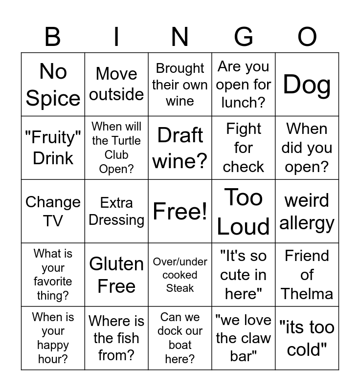 This bingo card has a free space and 24 words: Gluten Free, Where is the fish from?, Draft wine?, When is your happy hour?, Dog, No Spice, "Fruity" Drink, Move outside, Too Loud, Over/under cooked Steak, Fight for check, Change TV, "It's so cute in here", Friend of Thelma, When will the Turtle Club Open?, "we love the claw bar", weird allergy, Brought their own wine, When did you open?, Extra Dressing, "its too cold", What is your favorite thing?, Are you open for lunch? and Can we dock our boat here?.