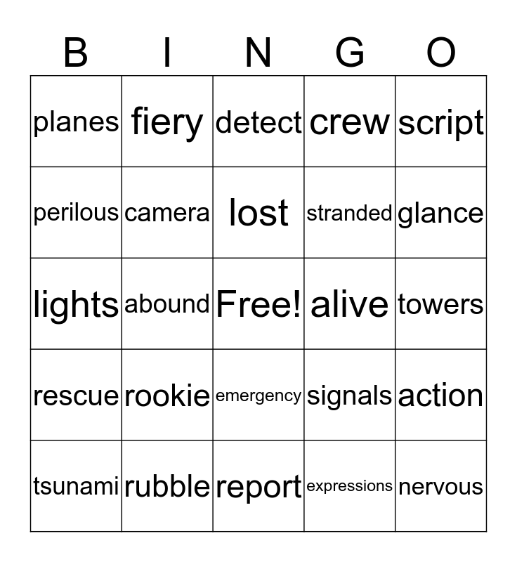 This bingo card has a free space and 24 words: rookie, rubble, lost, tsunami, script, planes, perilous, fiery, alive, emergency, stranded, lights, signals, action, camera, expressions, towers, detect, glance, abound, nervous, rescue, crew and report.