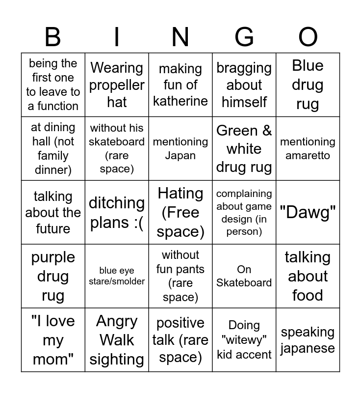 This bingo card has a free space and 24 words: blue eye stare/smolder, Angry Walk sighting, mentioning Japan, "I love my mom", Blue drug rug, being the first one to leave to a function, at dining hall (not family dinner), Wearing propeller hat, complaining about game design (in person), without fun pants (rare space), Green & white drug rug, talking about the future, On Skateboard, talking about food, without his skateboard (rare space), Doing "witewy" kid accent, "Dawg", making fun of katherine, mentioning amaretto, ditching plans :(, speaking japanese, purple drug rug, bragging about himself and positive talk (rare space).