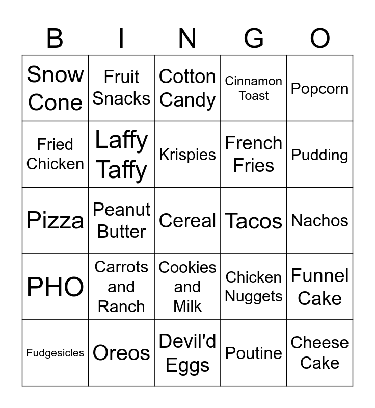 This bingo card has 40 words: Burgers, Pizza, Gummy Bears, Laffy Taffy, Oreos, Cookies and Milk, Krispies, Burritos, Popcorn, PHO, Peanut Butter, Cinnamon Toast, Cereal, Nachos, Tacos, Carrots and Ranch, Apple Slices, Snow Cone, Waffles, Cotton Candy, Funnel Cake, Poutine, French Fries, Fried Chicken, Cheese and Crackers, 7 Layer Dip, Pasta Salad, Churros, Cheese Cake, Ice Cream, Popsicles, Fudgesicles, Chili, Chicken Nuggets, Pudding, Devil'd Eggs, Spinach Dip, Granola Bars, Fruit Snacks and Pie.